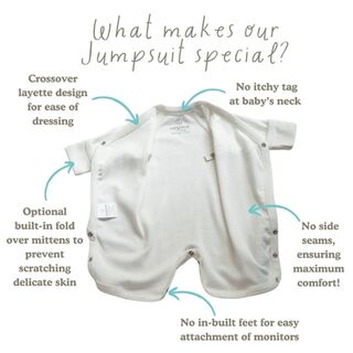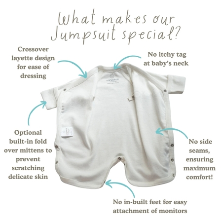 These soft cotton jumpsuits are perfect for smaller babies from the NICU to home! Similar to an All in One style but without feet, the Jumpsuit has mitten cuffs to prevent baby from scratching (or from pulling out their tubes!) a crossover layette front, and no internal seams to keep baby comfortable. Both the Natural and Pink colours have a Hearts print across the chest, and the Blue is printed with Stars.