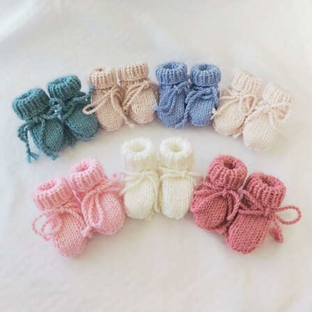 Gorgeous merino knit booties to keep those tiny toes warm, featuring a stretchy rib cuff and soft bow ties to help them stay on. The bootie colours match perfectly with our hats and cardigans for a prem sized layette, all lovingly hand knitted in New Zealand.