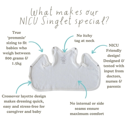This tiny organic singlet was designed with the help of neonatal specialists. A crossover layette front and eyelets on both shoulders means the singlet can be opened completely for gentle dressing. The baby's monitor leads are also easily accessible with minimal disturbance.