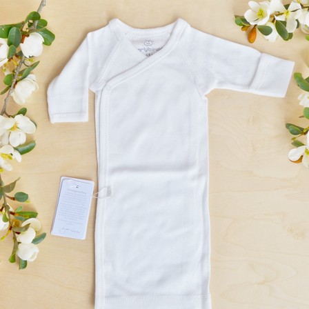 A gorgeous little gown designed with the help of neonatal specialists. The gentle front opening with domes allows for easy dressing and accessing baby's medical equipment with minimal disturbance, as well as for those night time nappy changes! Mitten sleeve cuffs fold down to keep baby's fingers warm and helps to prevent baby pulling out their tubes.