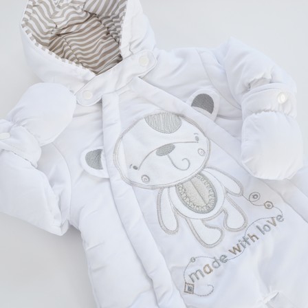 This padded Snow Suit will keep your little baby warm and comfortable. Features removable mittens, a double zip opening down the front and lined in a soft cotton flannelette. The Teddy Bear design is embroidered on the front panel.